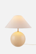 Den ljuva bordslampan Iris är som en liten karamell som lyser upp rummet med sin glada färg och uttryck. Inspirationen till lampan fann formgivaren Erika Norén i den gamla traditionella bordslampan till sin form, en helt vanlig lampa, med en klotformad lampfot och en traditionell lampskärm. Genom att addera några samtida detaljer såsom lampfoten i genomfärgat glas, med detaljer som oregelbundna inblåsta bubblor och en matchande lampskärm i bomull med täckt topp och som går ton-i-ton med lampfoten, känns lampan som en självklar inredningsdetalj i många samtida inredningar. Lampan är aningen större i storleken och passar utmärkt att placera på och lysa upp ett sidobord, större byrå eller i ett djupare fönster. Lampan har en 200 cm lång beige, pärlemorfärgad textilkabel med brytare och stickkontakt. Notera att luftbubblorna i glaset varierar i storlek och skapar ett unikt mönster för varje lampa, därför kan lampan just du får avvika en aning från bilderna.