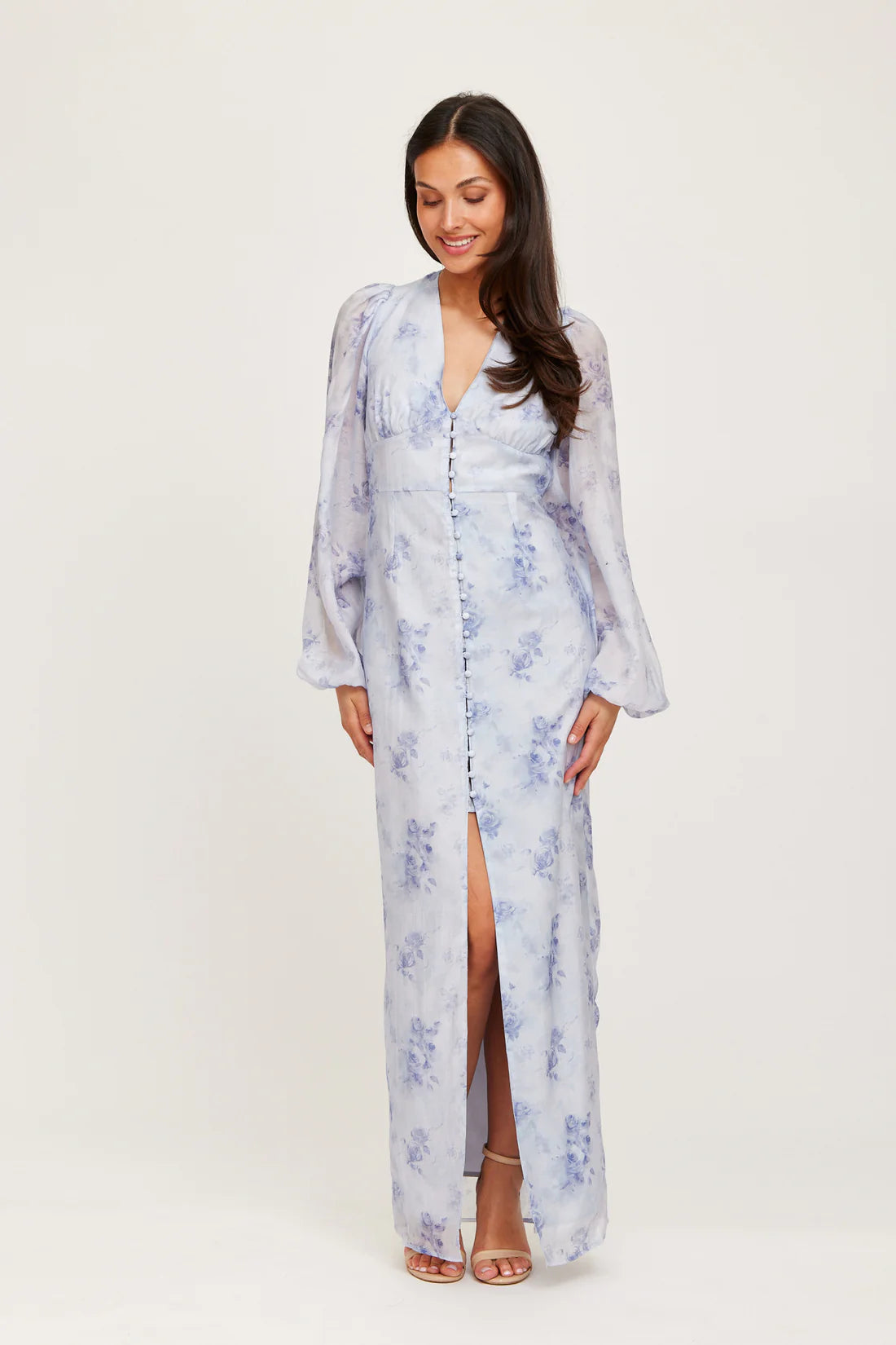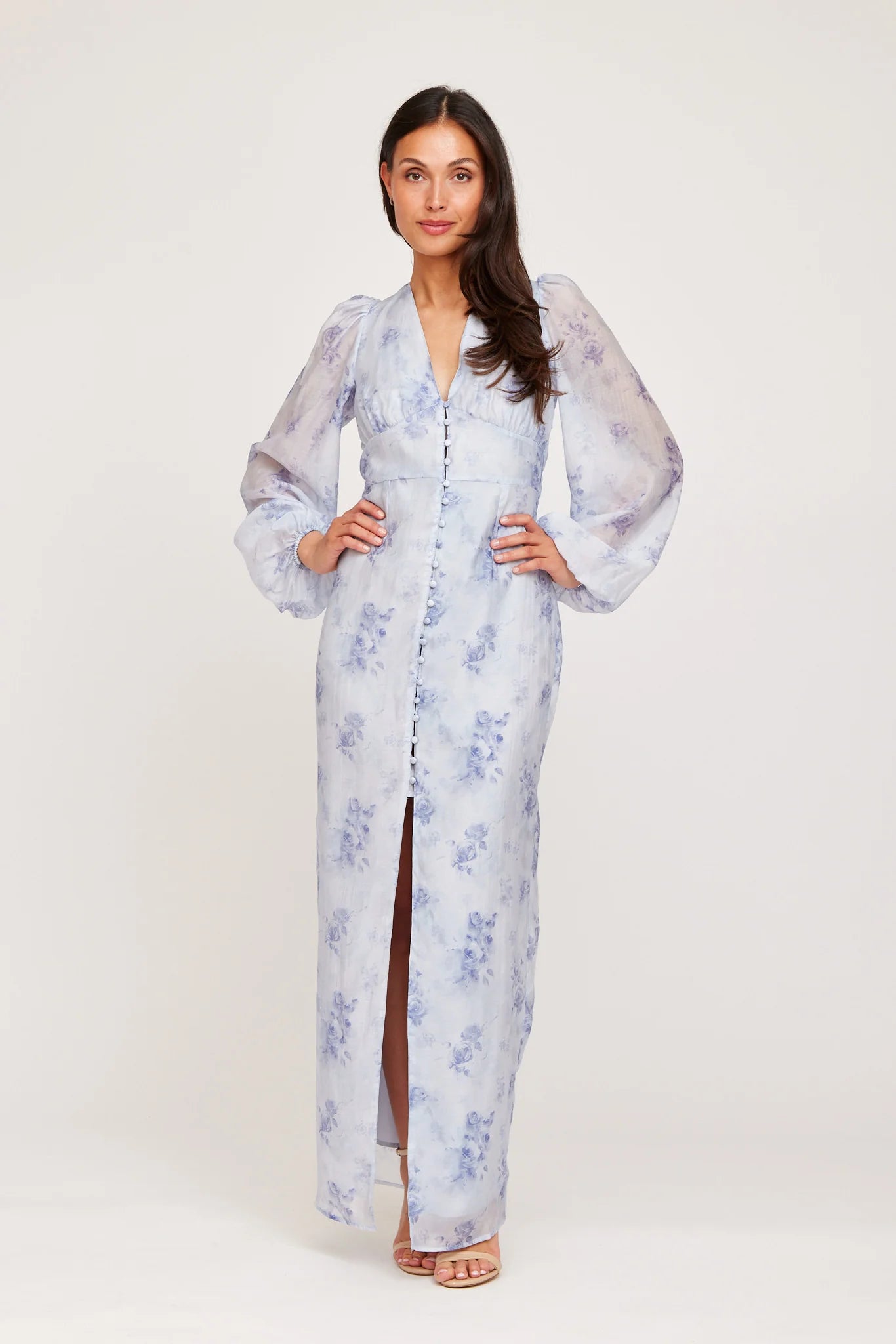 A graceful full-length dress featuring a soft, watercolor-inspired floral print in serene pastel tones. Designed with a flattering V-neckline, delicate button detailing, and voluminous long sleeves that add a touch of romantic elegance. The fluid silhouette is complemented by a refined front slit, offering movement and subtle allure.