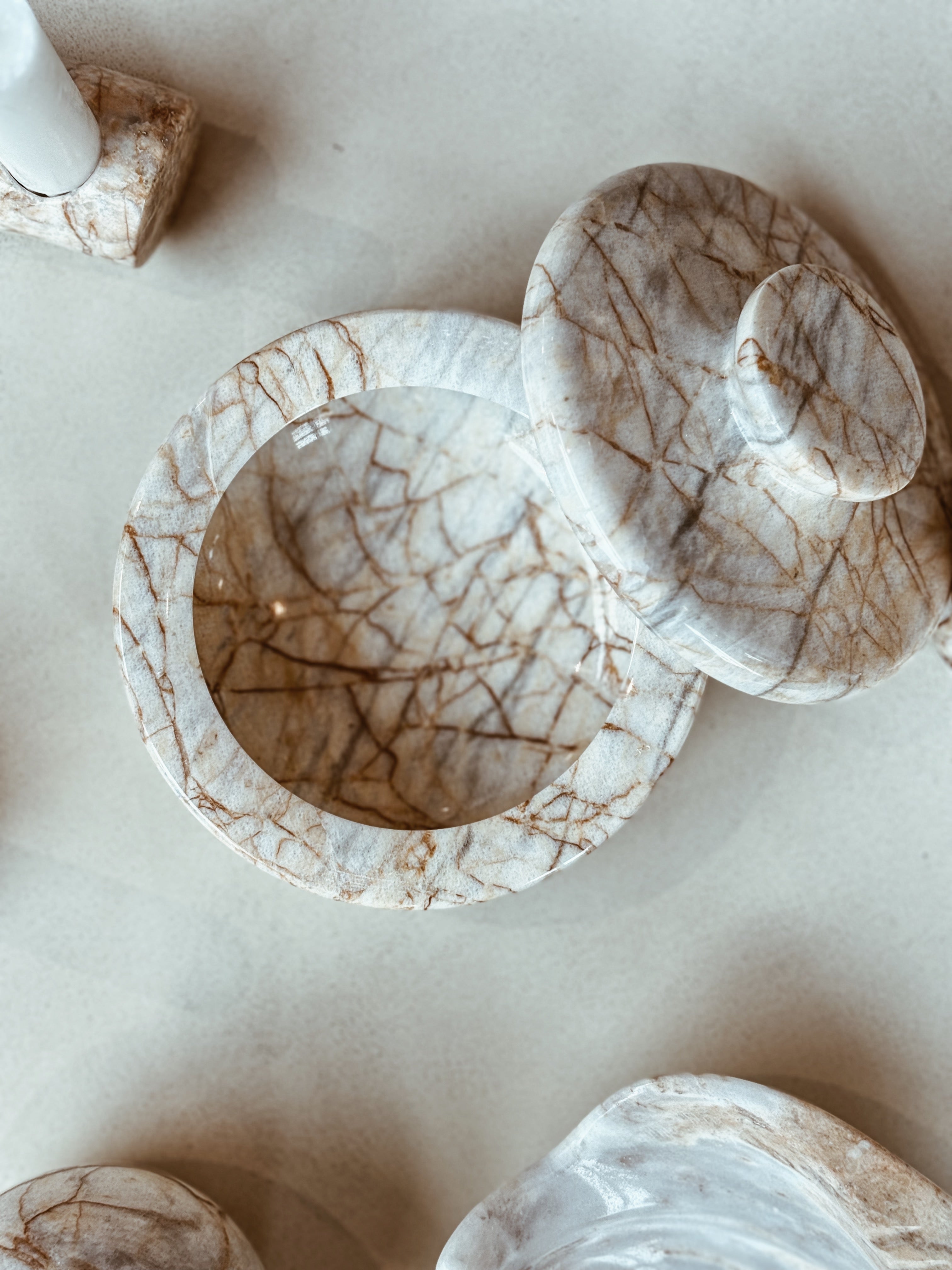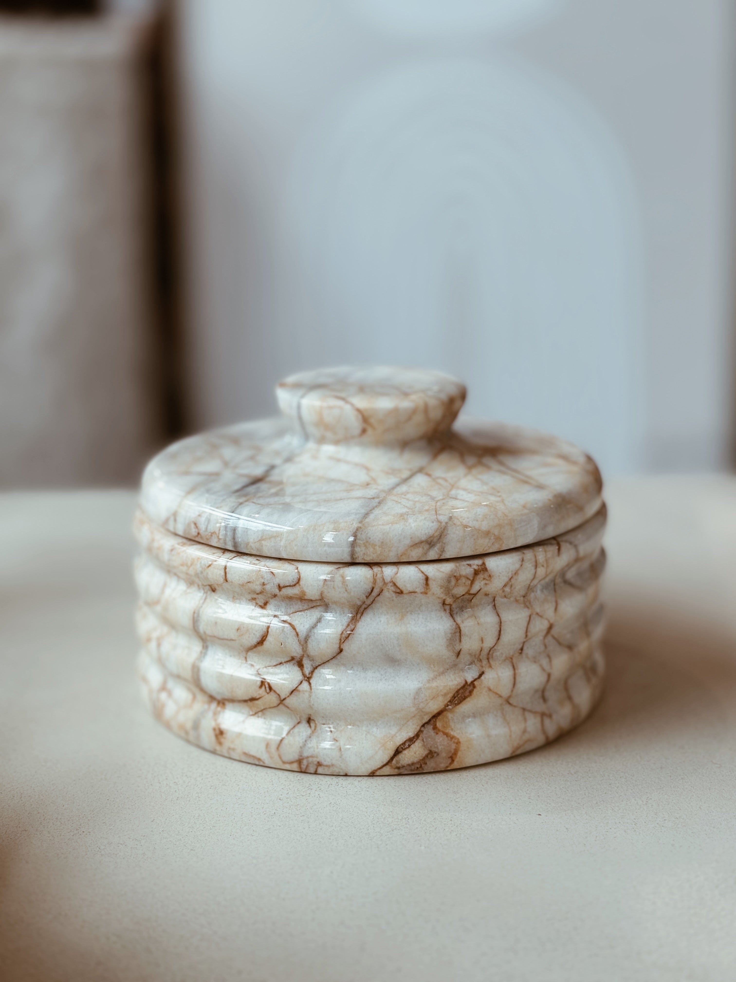 Otroligt fin dekorationsask i marmor. Perfekt på en inredningsbok som ett stilleben eller smyckes/godis gömma. 13 cm diameter 6 cm hög.
