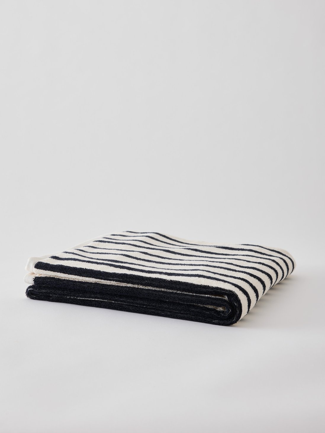 Detta badlakan i ekologisk bomull är vävt med klassisk frottéteknik, vilket ger en mjuk känsla och utmärkt absorptionsförmåga. Den stilrena designen i svart och vit randning kombinerar funktionalitet med elegans. Den generösa storleken på 70x140 cm gör det perfekt att svepa in sig i efter ett bad eller en dusch. Bonnie finns även som handduk i storleken 50x70 cm, vilket gör det enkelt att matcha för en enhetlig badrumsstil.