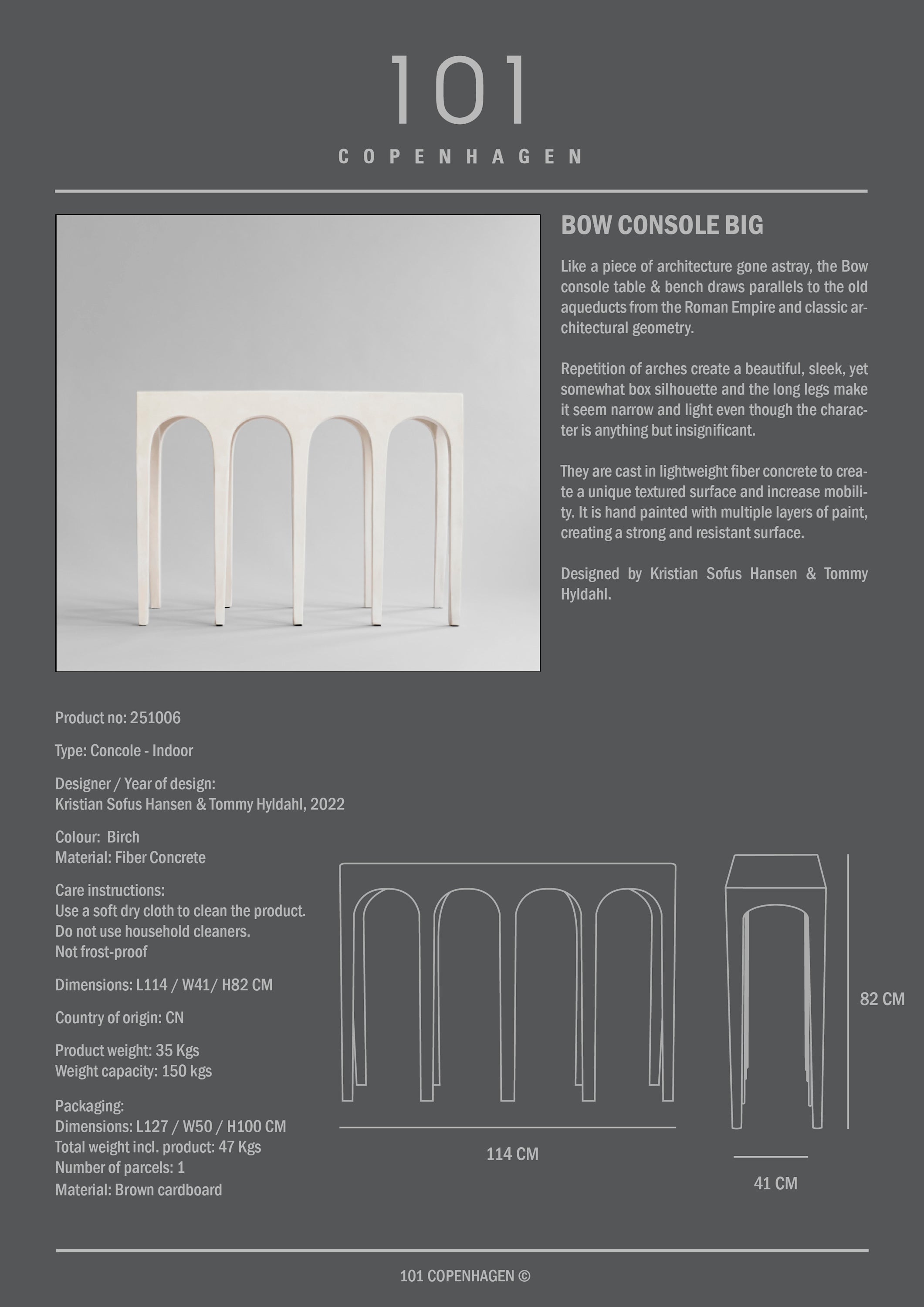 The Bow series stands as a testament to timeless design, reminiscent of the architectural grandeur of the ancient Roman aqueducts and classic geometrical precision. With its sequence of arches, this collection offers a sleek and sophisticated silhouette that is both understated and commanding. The elongated legs lend an air of elegance and lightness, defying the substantial presence of these pieces. Crafted from lightweight fiber concrete, the Bow series not only showcases a distinctively textured surface but also boasts enhanced portability. Each piece is meticulously hand-painted with multiple layers, ensuring a durable and resilient finish that is built to last. This collection comprises two sizes of console tables along with a bench, offering versatile options that seamlessly blend with any interior space. Conceived by the visionary minds of Kristian Sofus Hansen & Tommy Hyldahl, the Bow series is a harmonious blend of form and function, solidifying its status as a striking addition to contemporary design.
