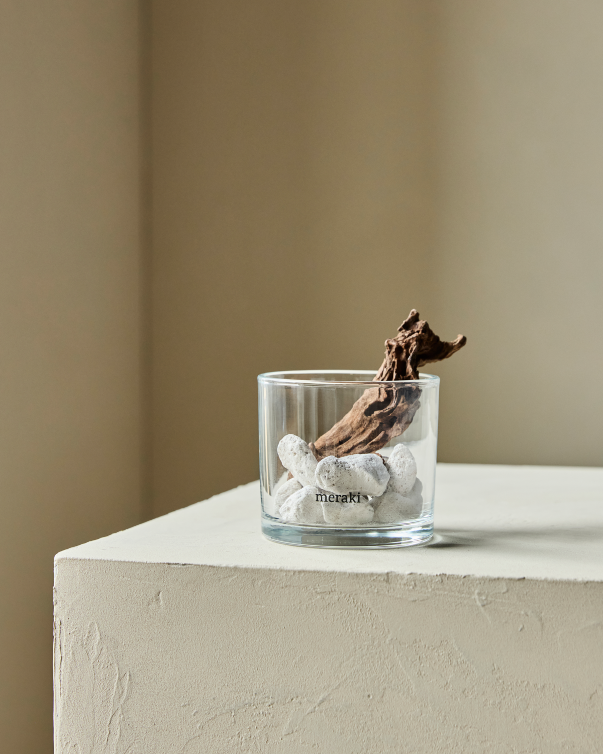 - Naturlig och dekorativ med vita lavastenar och drivved.