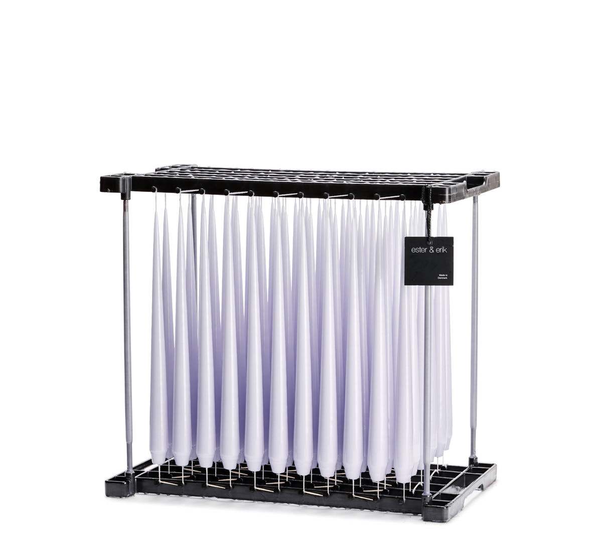 De här underbara ljusen passar i mellanstorleken på ljusstakarna från Ester & Erik, men de passar även i de flesta andra ljusstakar eftersom de har en konformad botten. Brinntid: 8 timmar Ester & Eriks ljus är tillverkat med traditionell doppteknik. Varje enskild bomullsplatta doppas flera gånger i varm paraffin, av finaste kvalitet tills ett vackert ljus är skapat. Till sist färgas och målas ljusen för hand. Dopptekniken och den unika kvaliteten säkerställer ett välformat ljus med en ren och lugn flamma som sakta och elegant brinner ner och släcker sig själv. Ester & Erik väljer sina råvaror bland de ledande europeiska producenterna, och de ställer höga krav på varje leverantör. Därför kan vi garantera ett rent ljus utan lukt och sot som brinner långsamt utan att rinna.