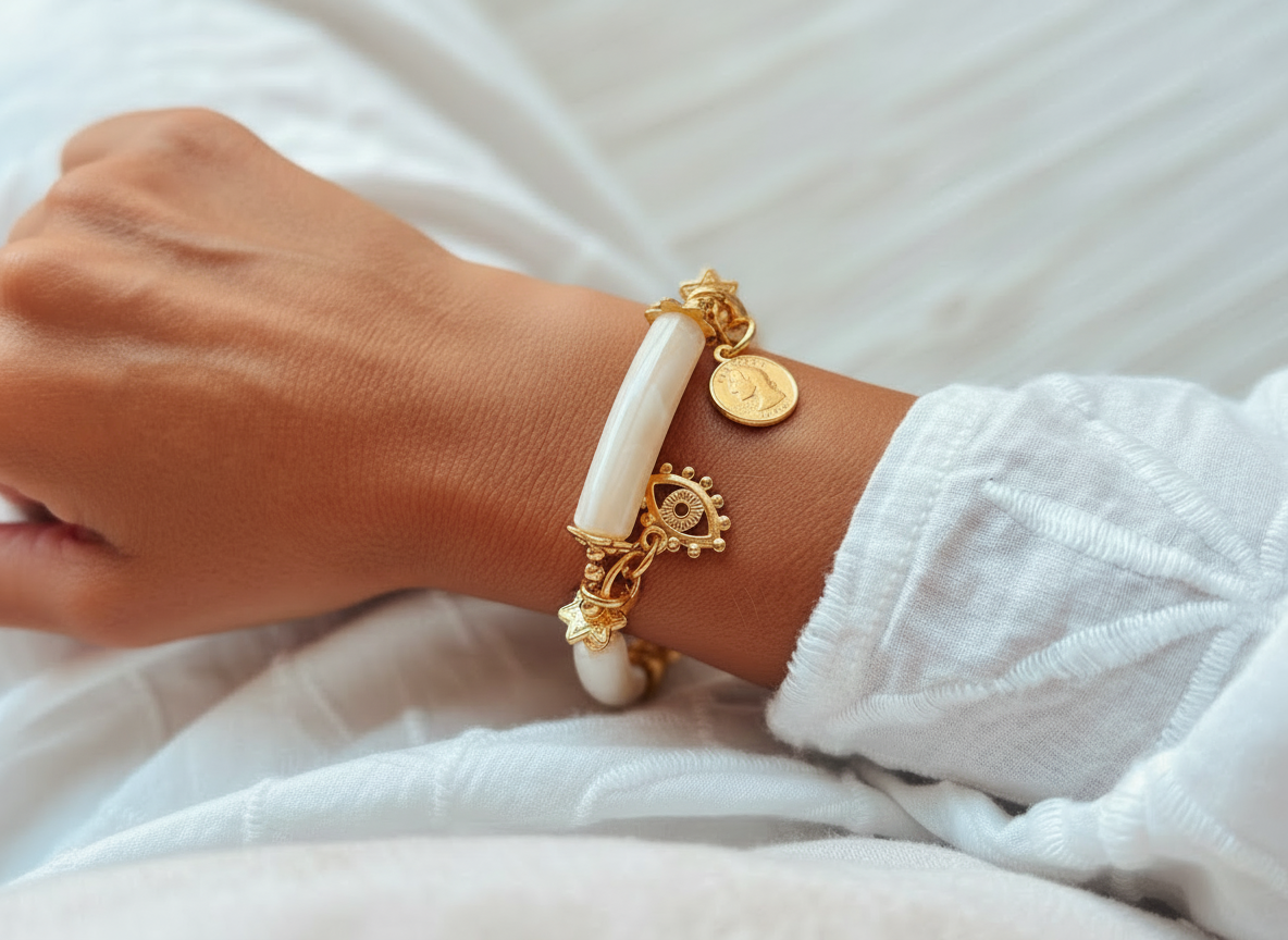 Bohemiskt armband med 24k guldpläterade detaljer. creme