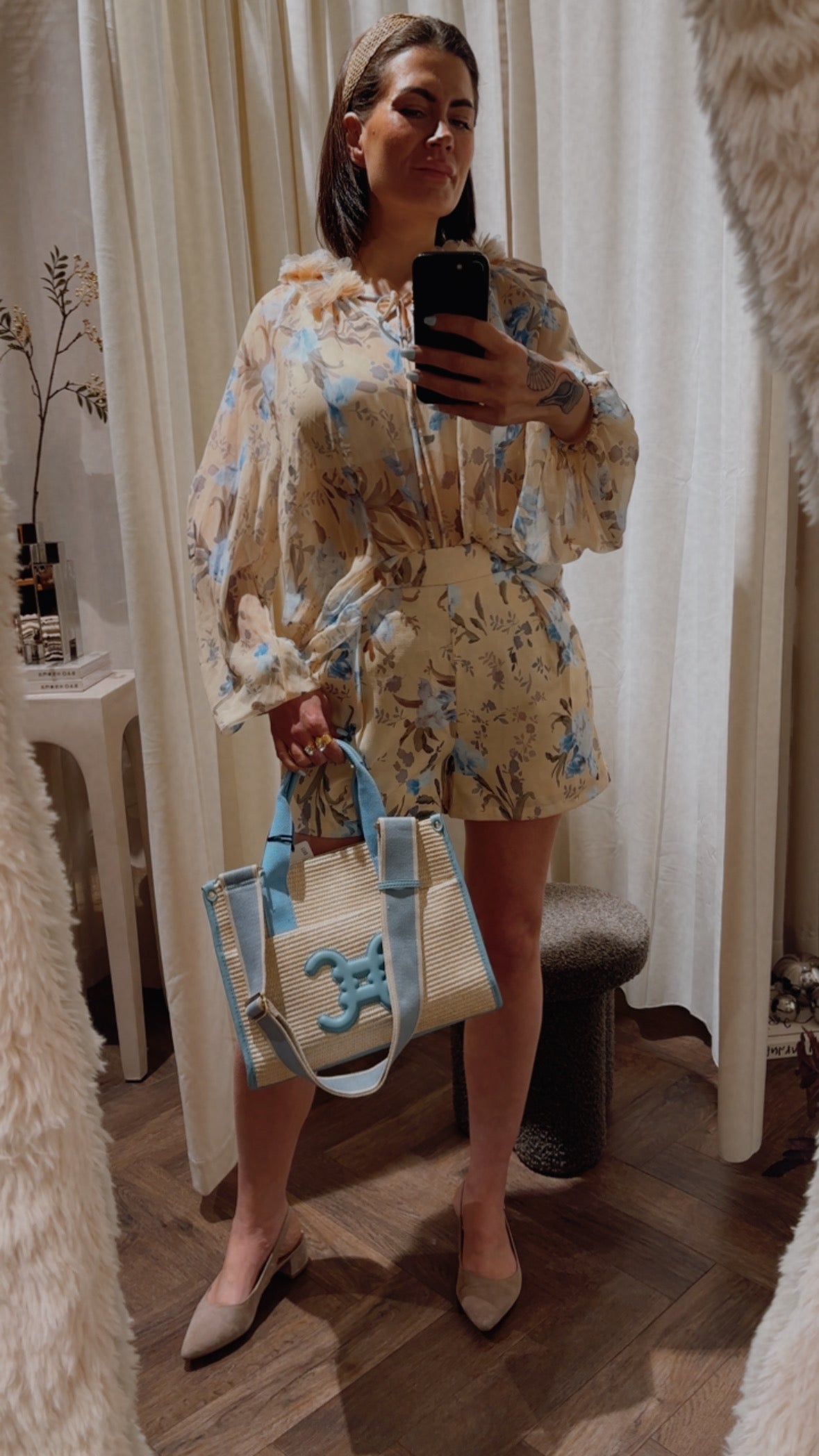 Blusen har vackra blomdetaljer runt krage och snören med knyt sas och är i ett härligt material. Resår i ärmsslut som gör att blusen enkelt går att dra upp. Det finns shorts i samma mönster som säljs separat. Detta set är designat i Frankrike. Blusen är normal rymligare i storlek. Composition: Cotton : 20%, Viscose : 80%