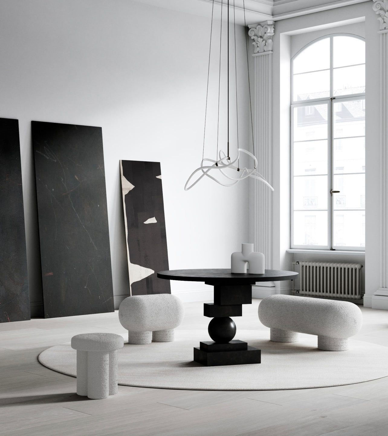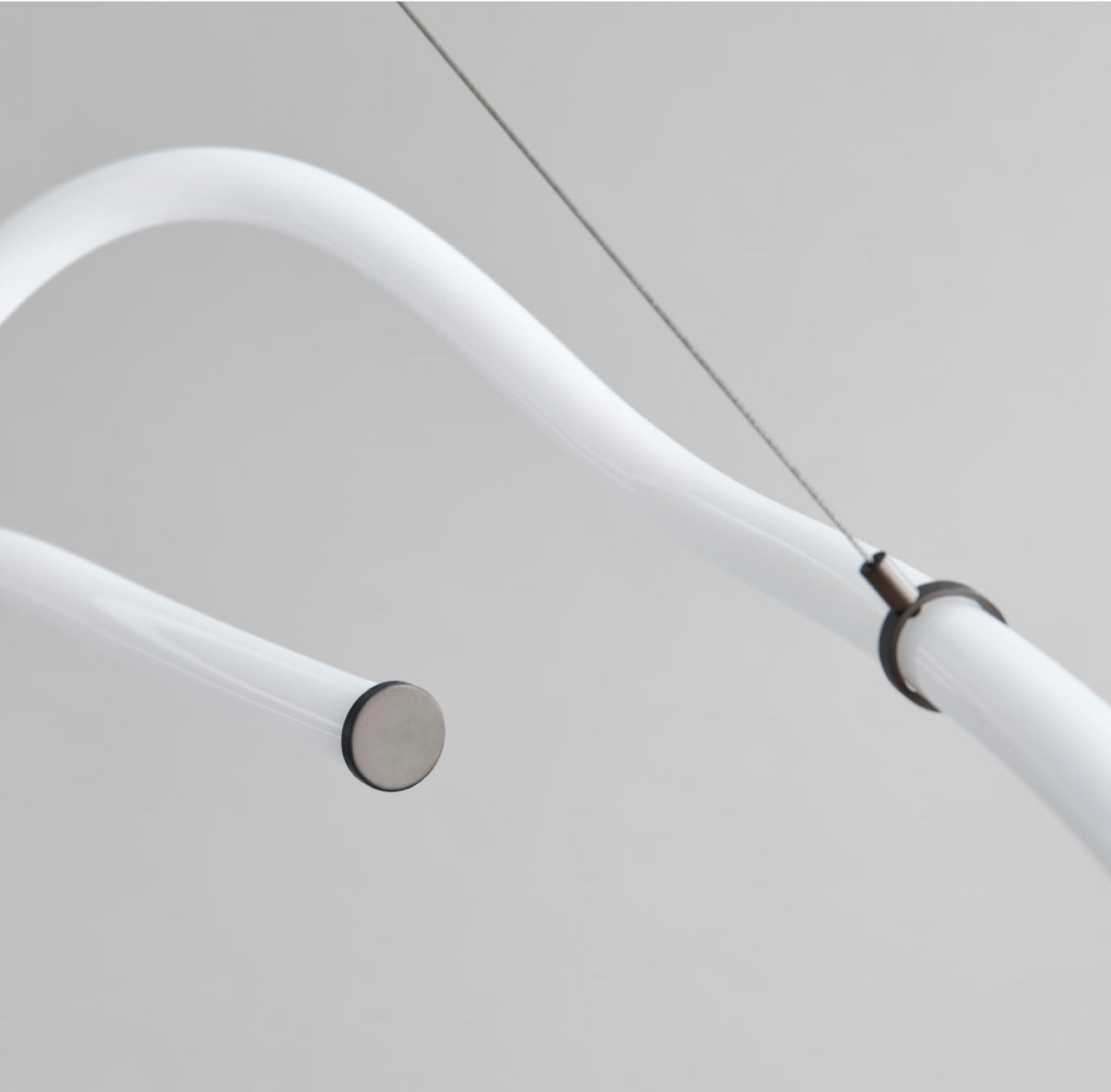 Drawing inspiration from minimalist art, the Ghost Chandelier seamlessly melds light with sculpture, embodying a graphic lighting aesthetic. The Ghost's defining feature is its radiant white acrylic tube, which flows in various directions, forging an ambient illumination reminiscent of organic patterns. Originating from a hand sketch, the design infuses spaces with an artistic and graphic ambiance. Its ever-evolving appearance captivates observers, morphing into diverse patterns and forms depending on one's vantage point. In any setting, Ghost asserts itself as a centrepiece.