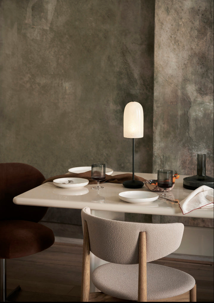 Gry Table Lamp är designad av Ferm Living. Bordslampan är döpt efter det danska ordet för gryning, då den sprider ett mjukt och försiktigt ljus som påminner om solens strålar som smyger sig genom morgondiset. Den är perfekt för utomhusbruk. Denna portabla lampa skapar enkelt den önskade stämningen med sin tre-stegs touchdimmer. Den texturerade glasfiberskärmen sprider ljuset vackert och ger bordslampan dess karaktäristiska glöd. Lampan är tillverkad i pulverlackerat stål och glasfiber. Den kommer med en icke urtagbar dimbar LED-ljuskälla som har en livslängd på 30 000 timmar.