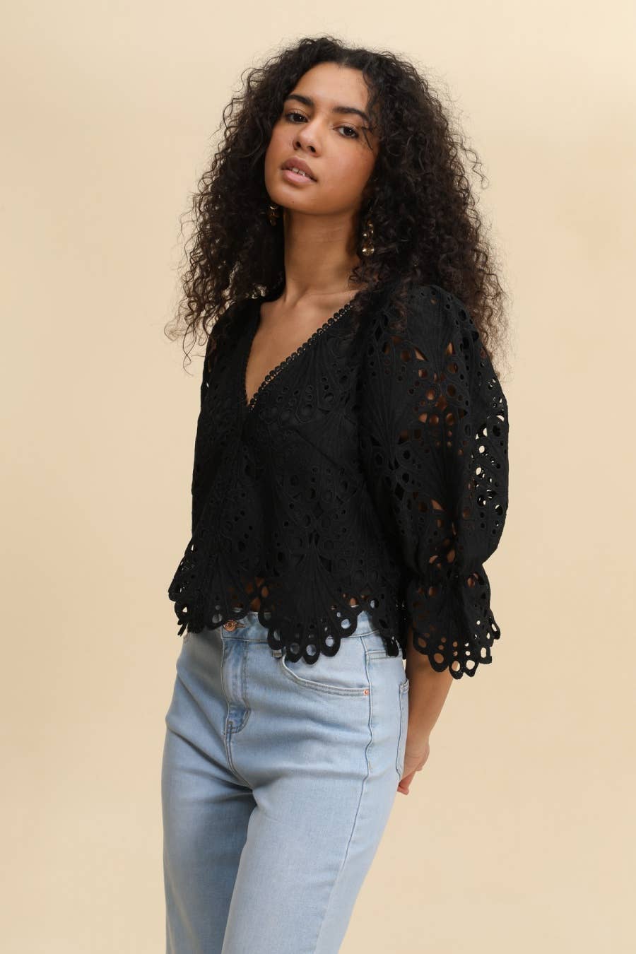 Lyxig Spetsblus med trekvarts ärmar som är puffiga och elastiska, v-ringning, innerfoder och croppad längd.