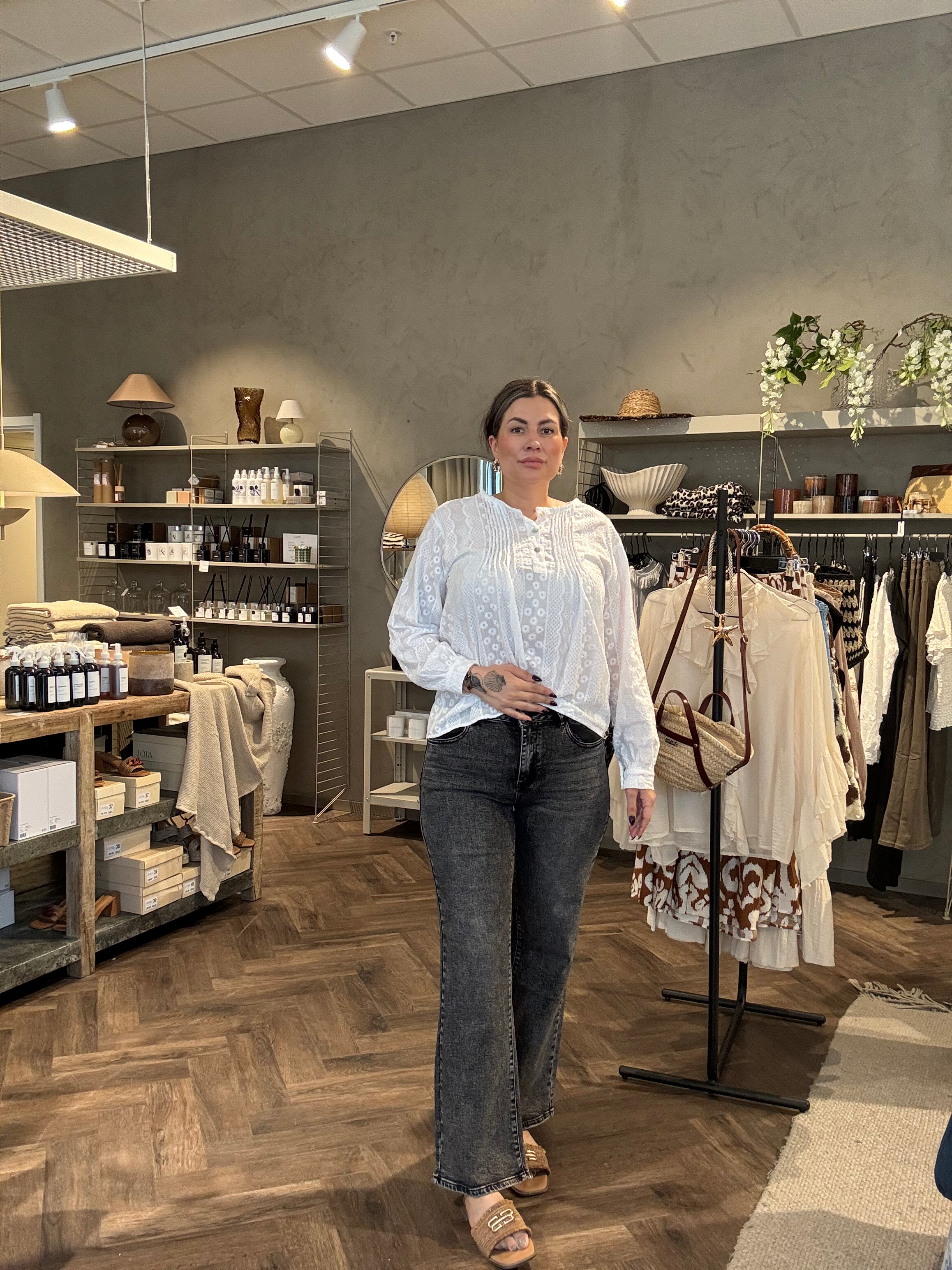 Dessa högmidjade wide leg-jeans med stretch är ett måste för en trendig och smickrande siluett. Tillverkade i ett stretchmaterial, formar de sig bekvämt efter kroppen samtidigt som de behåller en fin struktur. Den höga midjan framhäver siluetten och betonar midjan, medan den vida passformen ger en avslappnad men chic look. Oavsett om du kombinerar dem med sneakers för en avslappnad stil eller med klackar för en mer sofistikerad look, anpassar sig dessa jeans efter alla dina önskemål.