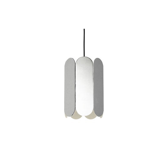 The shade can be used as a table lamp or pendant lamp suspended from the ceiling, both options forming contrasts in depth, colour and shape, resulting in an elegant scalloped silhouette. Crafted in steel, Arcs is available in several different colours or with a mirror surface.