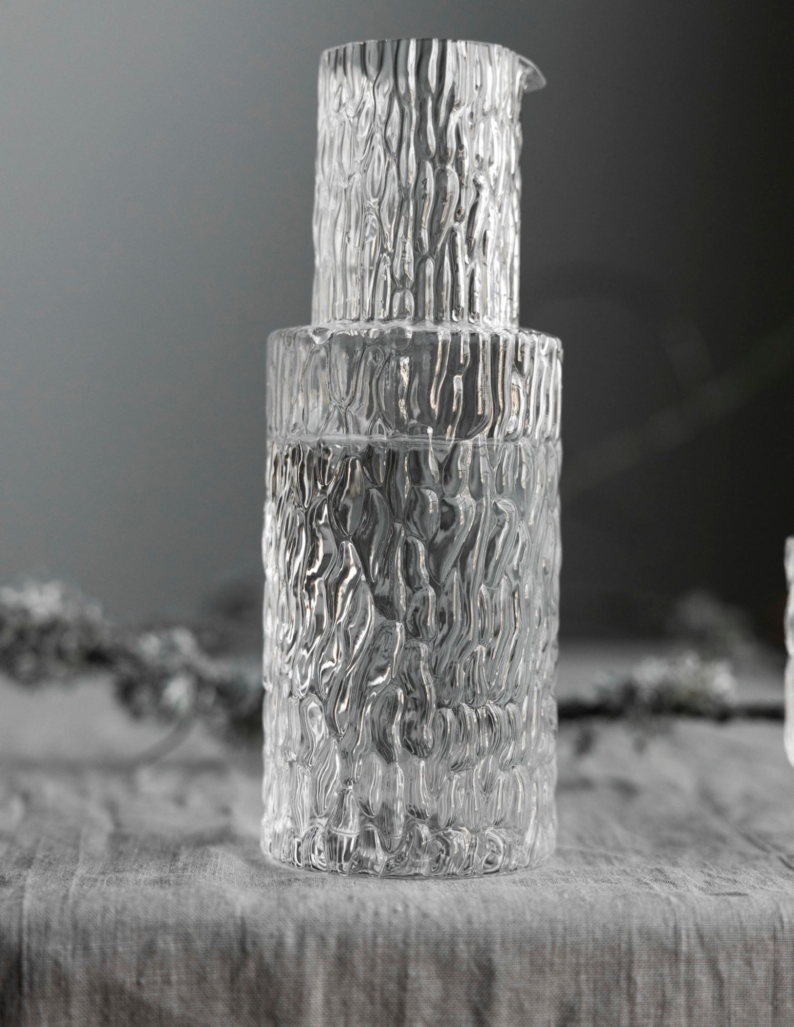 Karaff i tidlöst räfflat glas. Ett praktiskt tillbehör för att servera dryck i eller varför inte sätta en liten blomsterbukett i när den inte används till servering.