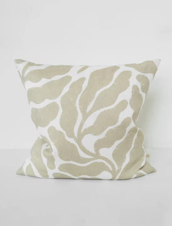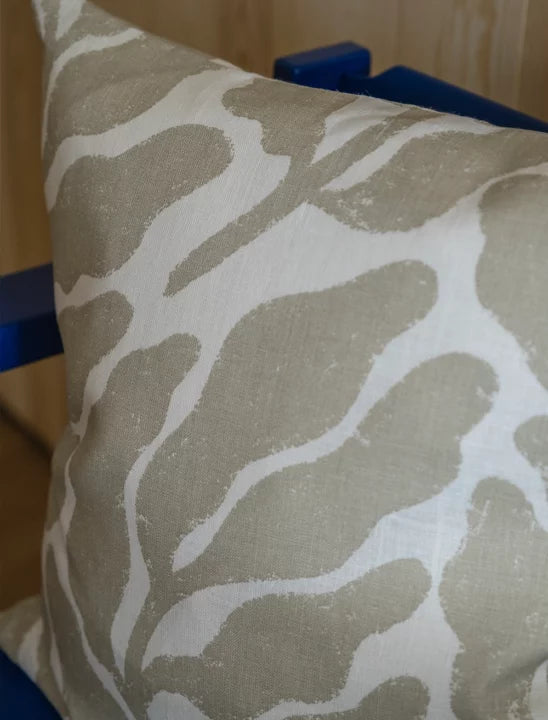Kuddfodral i hellinne med dubbelsidigt tryck med mönstret Leaves av Linnéa Andersson. Den Göteborgsbaserade konstnären är känd för sina böljande bladverk i klara färger. Hennes omtalade karaktäristiska botaniska mönster är minimalistiska och storslagna på samma gång.
