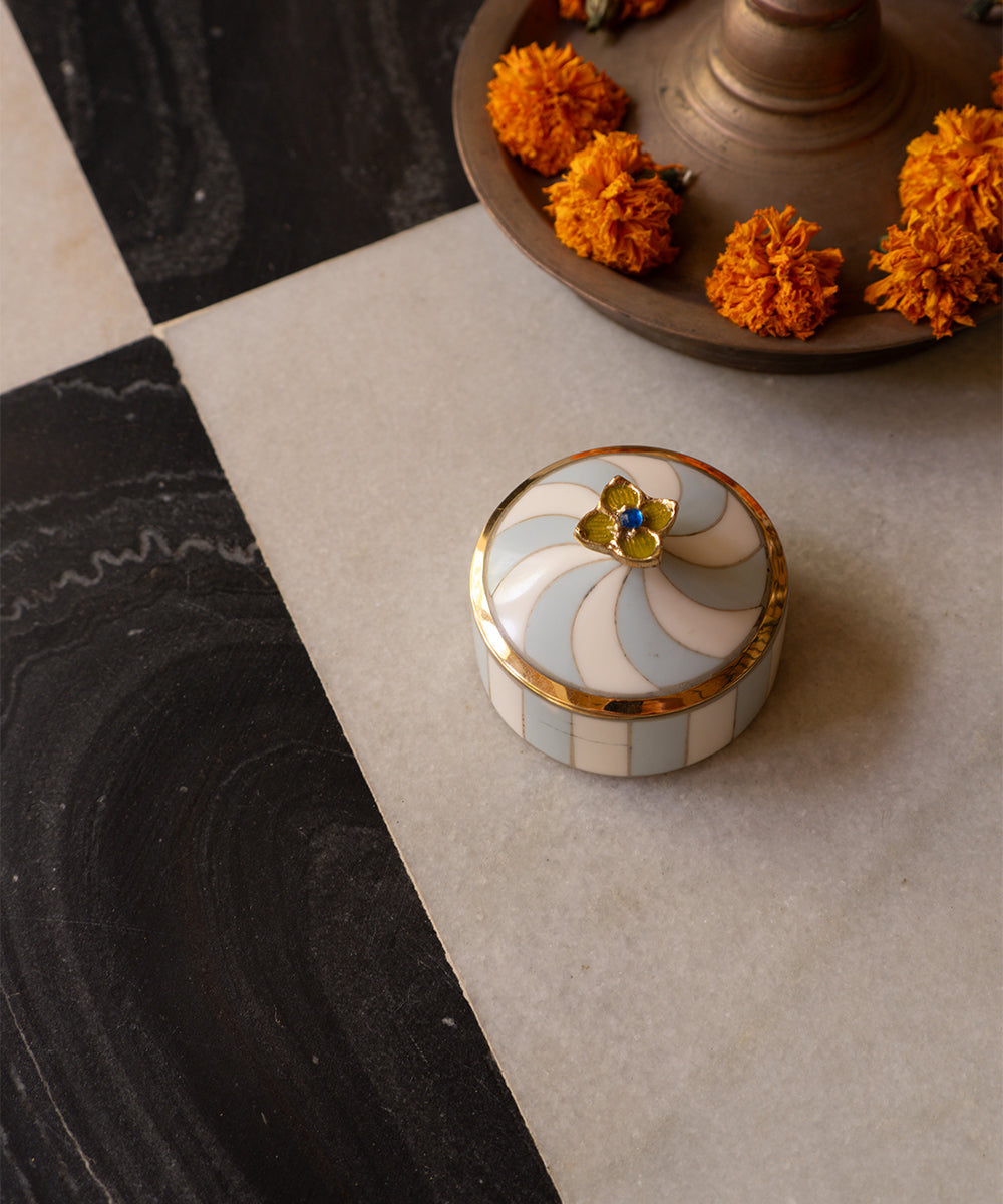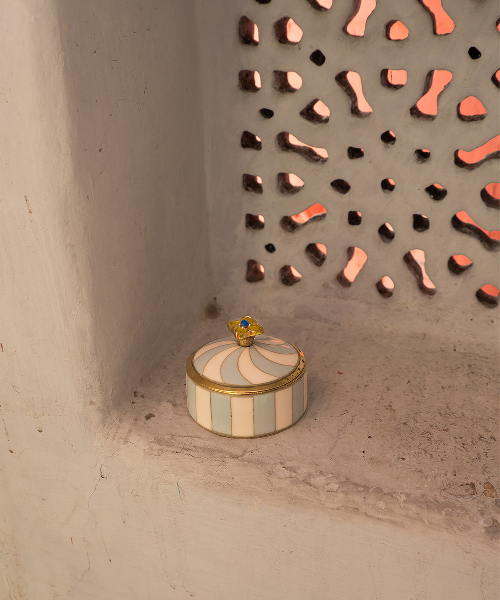 Bring charm and craftsmanship into your home with the Lou Circus Box Medium Blue, a beautifully handcrafted trinket container that blends nostalgic design with modern elegance. Featuring alternating soft blue and white stripes, a dome lid with a golden handle, and a touch of shell inlay, this compact piece (7 x 7 x 5 cm) is perfect for storing small jewelry, keepsakes, or cherished mementos.