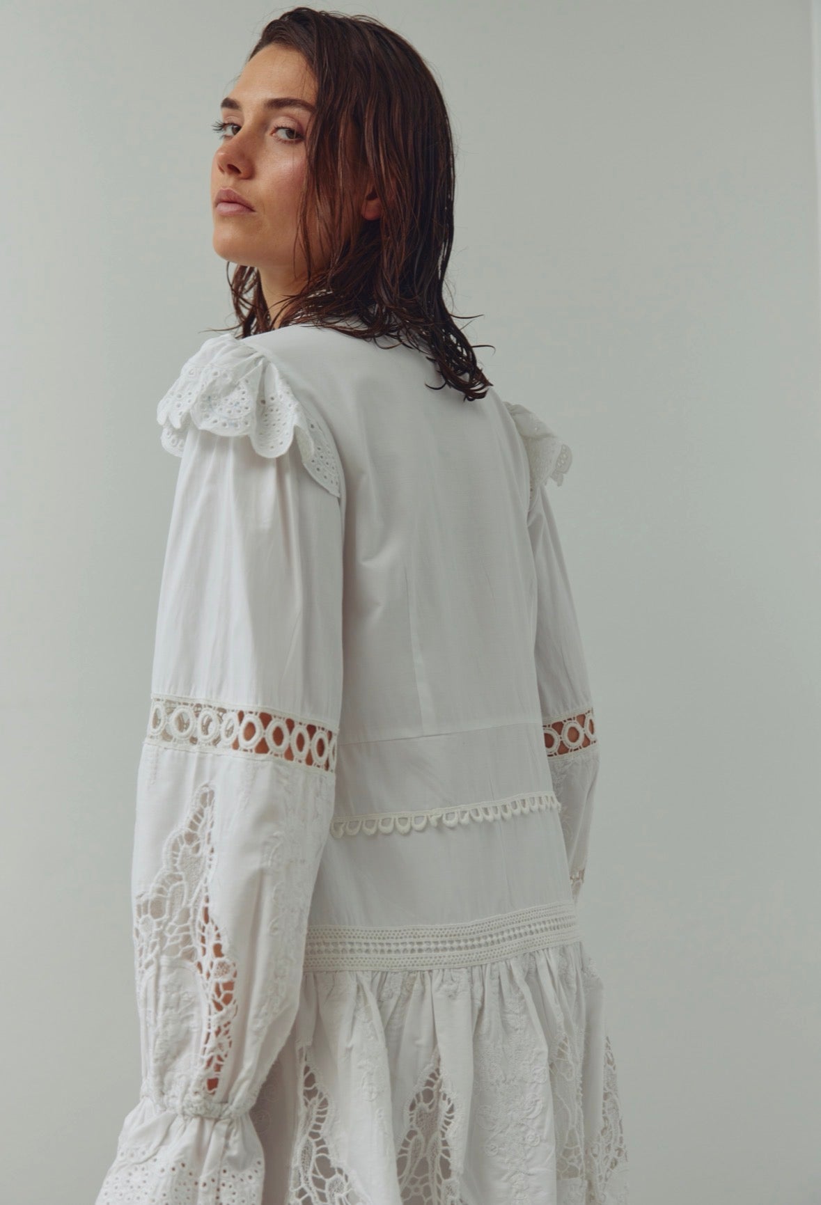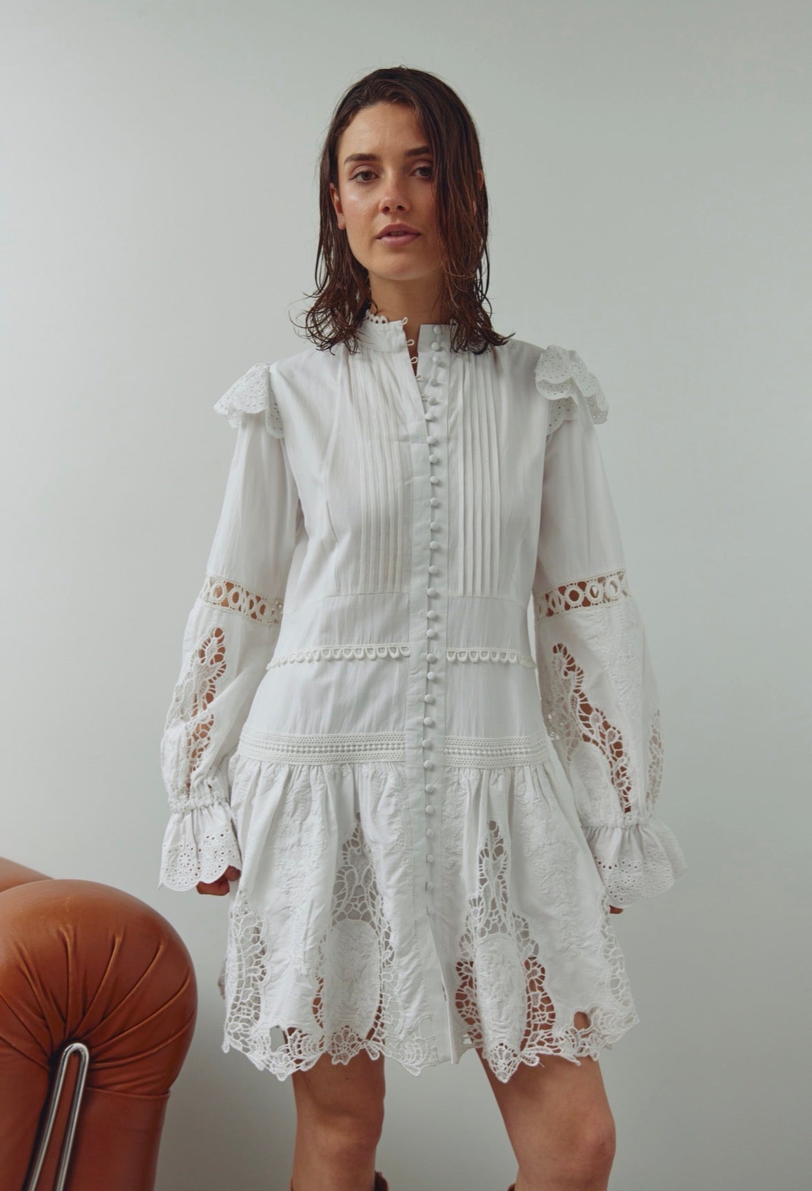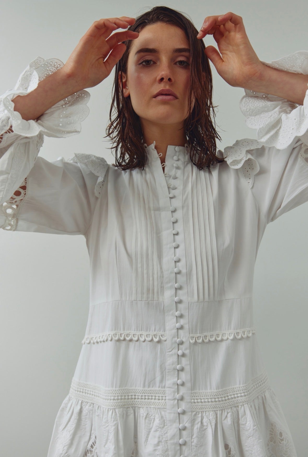 N-Milana Dress is a short dress with a defined hip cutline and flared, broderie anglaise skirt. The style has long sleeves with lace-band detailing and broderie anglaise. Designed with soft ruffles at shoulder for a nice silhouette.