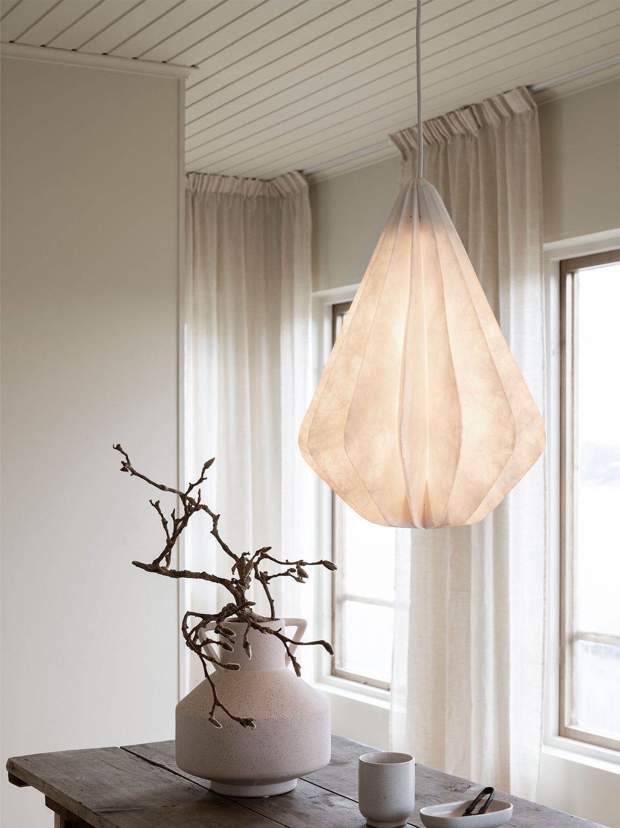 Höjd47 cm Diameter34 cm FärgVit FinishMatt MaterialTyvec Material sladdTextil Färg sladdVit Längd sladd150 cm SockelE27 Max watt11 TakupphängIngår Takkopp färgVit Takkopp materialMetall