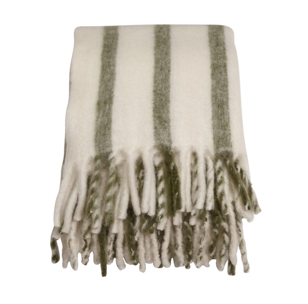 Mjuk tjockare pläd i en borstad ullblandning med fransar. Randig som matchar de enfärgade Morgan.