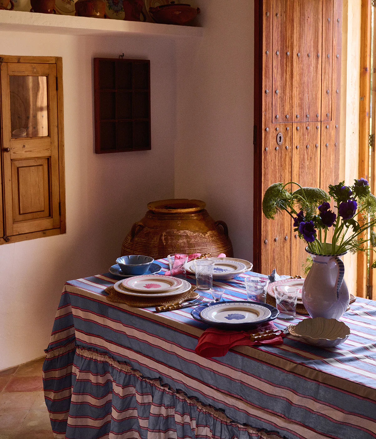 Sätt den rätta grunden till din dukning med vår randiga bordsduk Somerset i en lekfull volangdesign. Handvävd av infärgad bomull i Jaipur, Indien. Duken kommer i två vackra färgalternativ av blått och ljusrosa med kontrasterande ränder och finns i två storlekar.