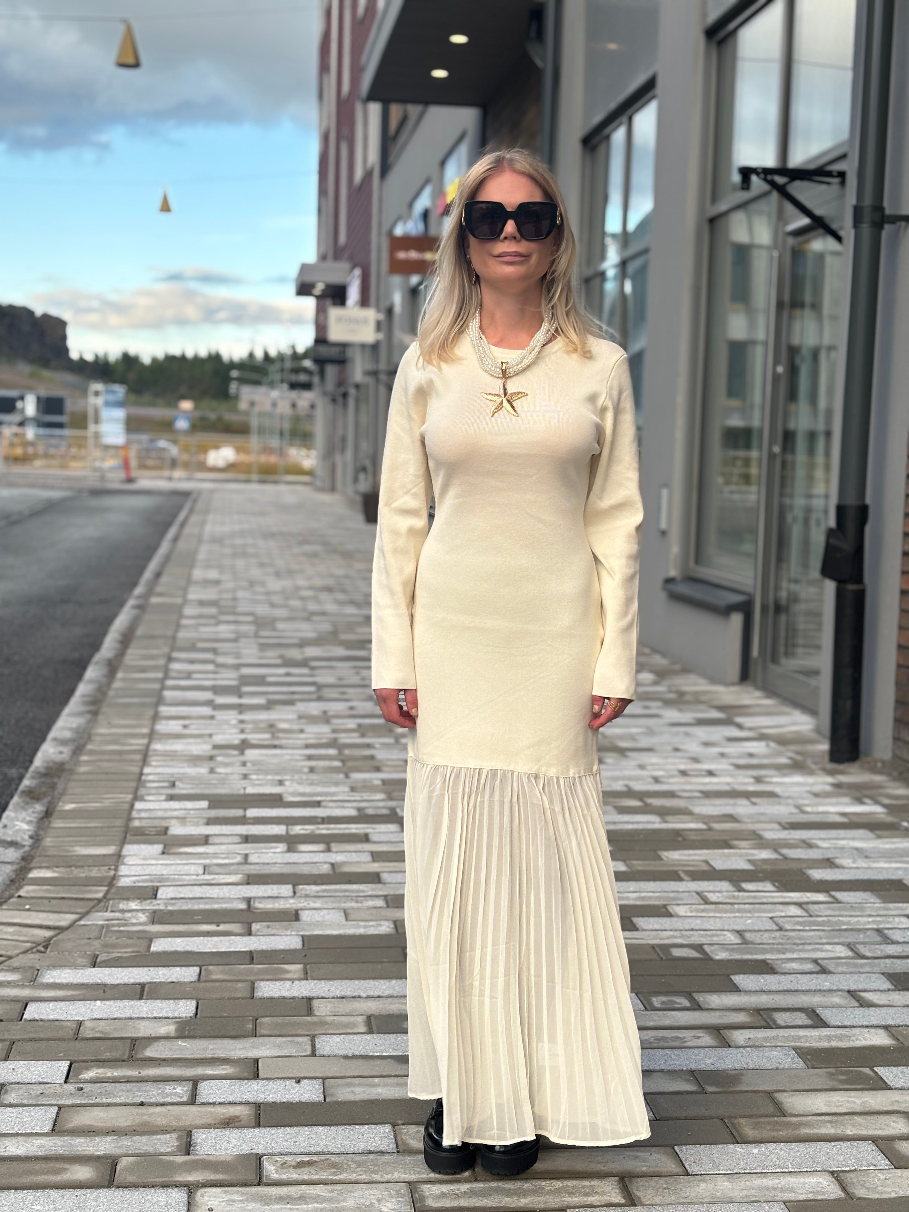 Klänningen är i en stretchig viscosemix & har en ihopsydd skir kjol i veckat plisserat tyg. Superfin!