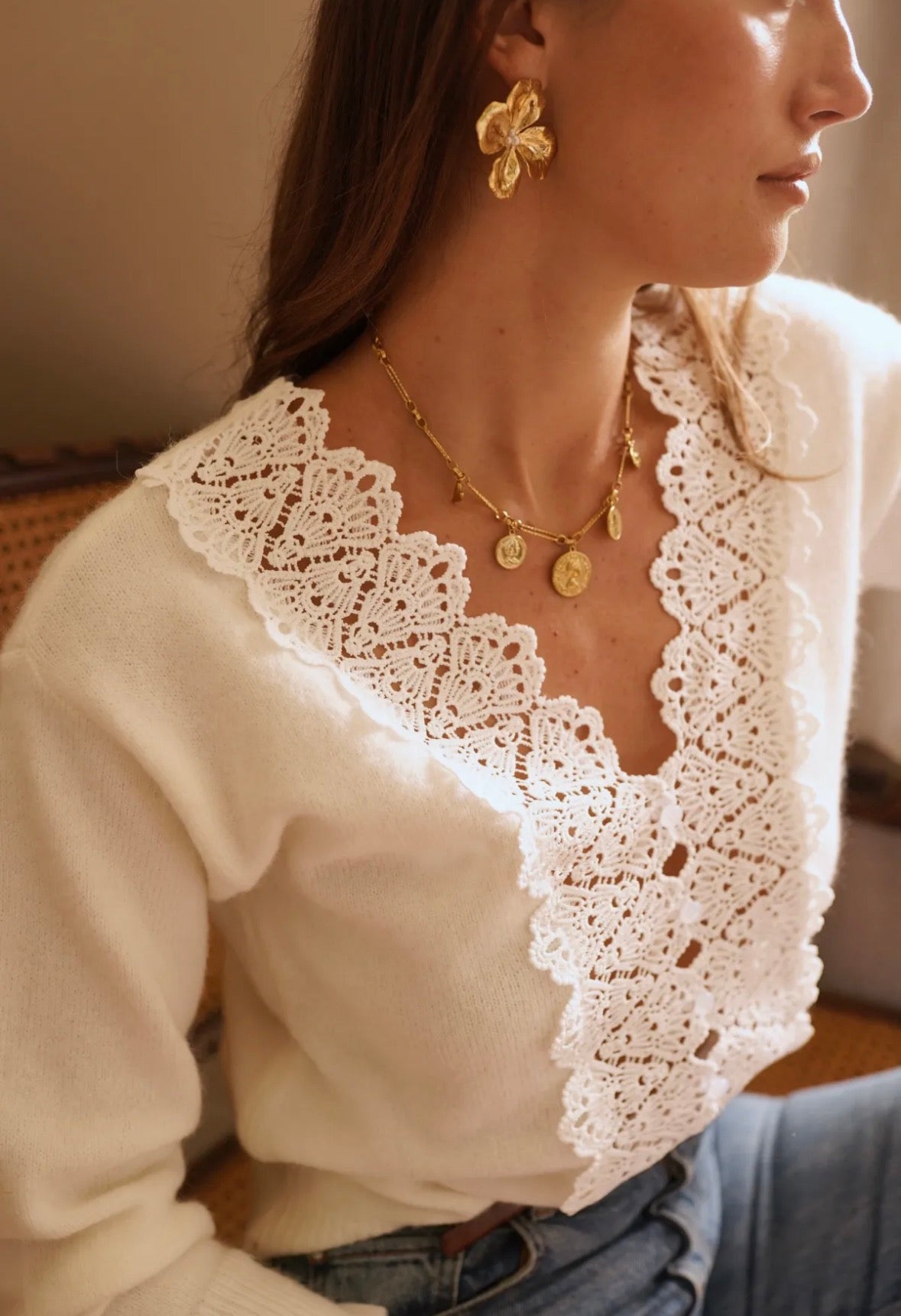Superfin stickad tröja med spetsdetaljer, tröjan går att ha åt båda hållen.