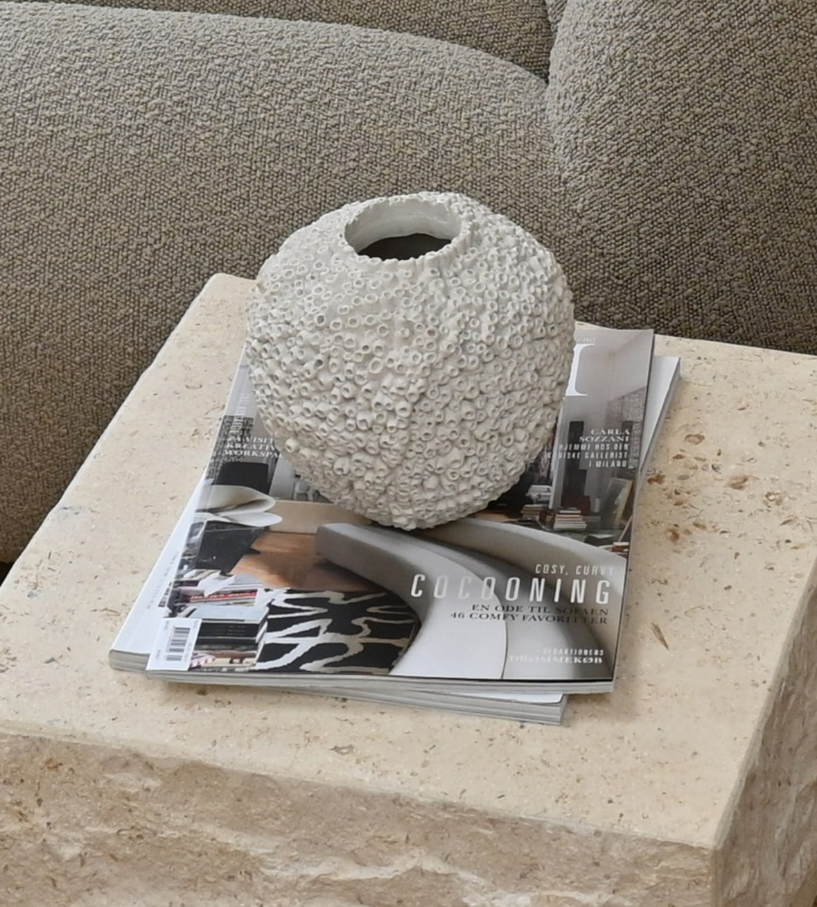 Sunao comes in two texture variations. A clean surface in Birch and Black colour and Beehive texture, emphasising a tactile and organic surface. Made from casts of shellfish found on a beach, the vase is a true wonder of nature.