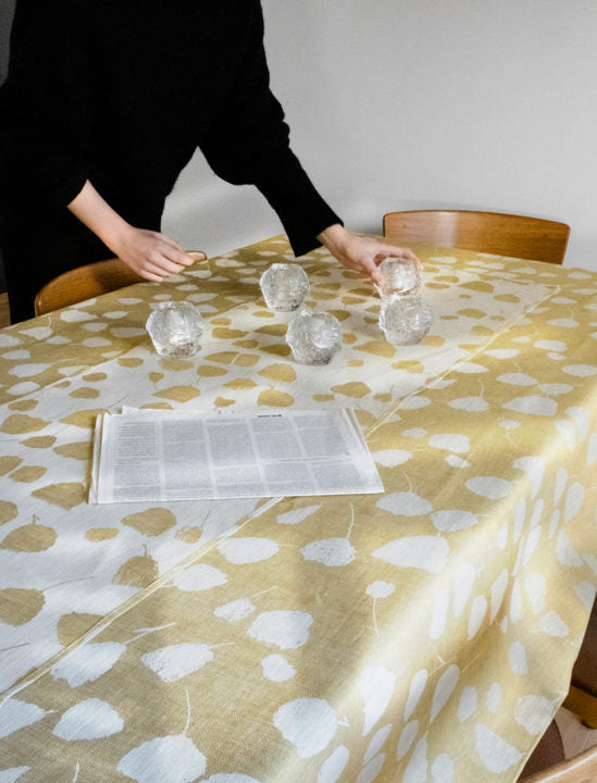 Mönstret Bouquet av Isis Maakestad på en vävd linnekollektion bestående av kökstextilier och löpmeter. Textilen är jacquardvävd vilket gör att färgerna inverterar på sidorna och skapar två uttryck i samma produkt. Duken finns i två längder och passar till både kantiga och runda bord.