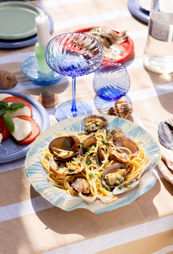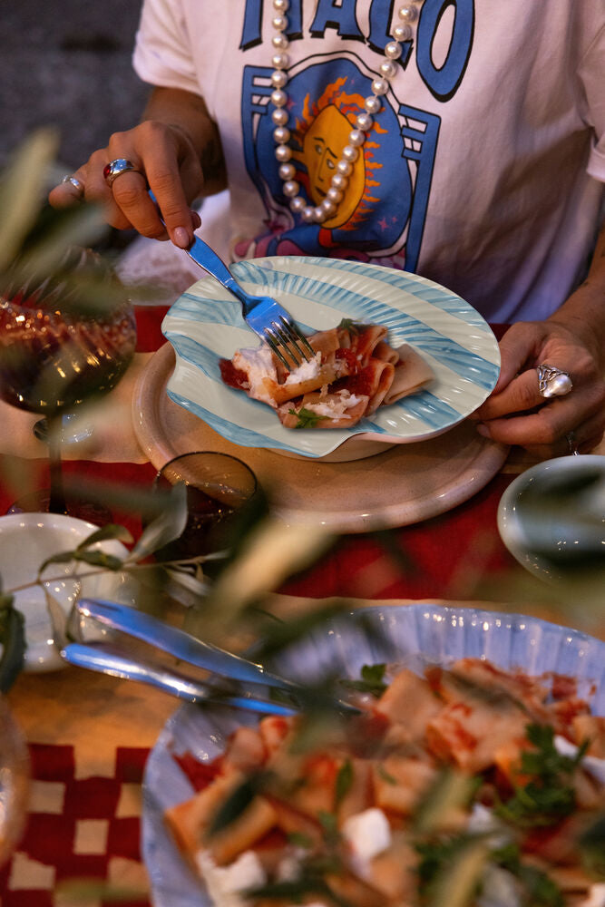 Armona är ett exklusivt handgjort och handmålat lergodsfat med vackra ränder i ljusblått och vitt, skapat i samarbete med MB Ceramics i Portugal. Inspirerad av havets skatter är varje fat unikt, perfekt för både servering och som en stilfull inredningsdetalj. Eftersom fatet är handgjort kan storlek, form och färg variera, vilket gör varje fat till ett unikt konstverk. Designad av Matias Belo x Byon Studio. Finns i två storlekar.