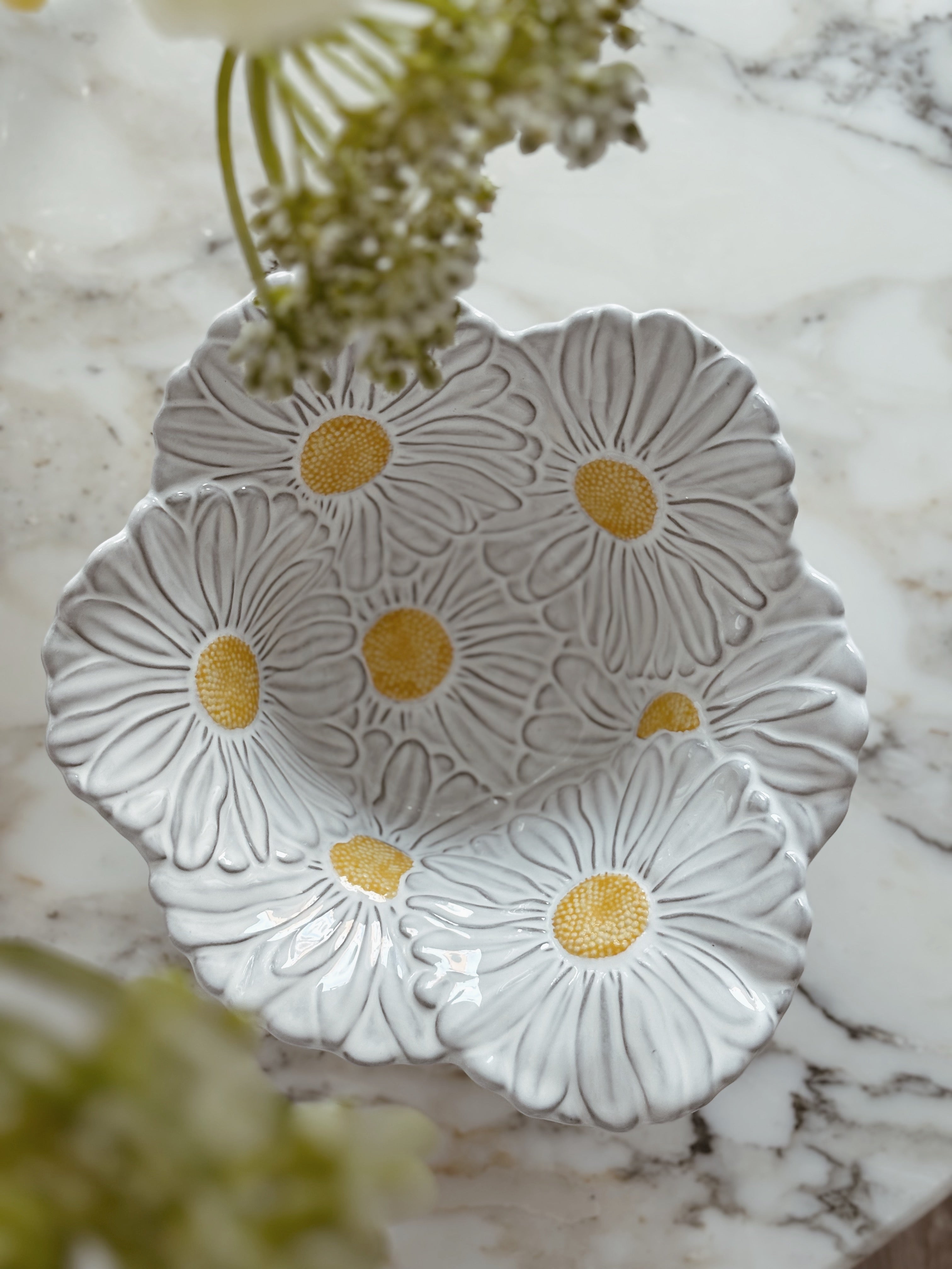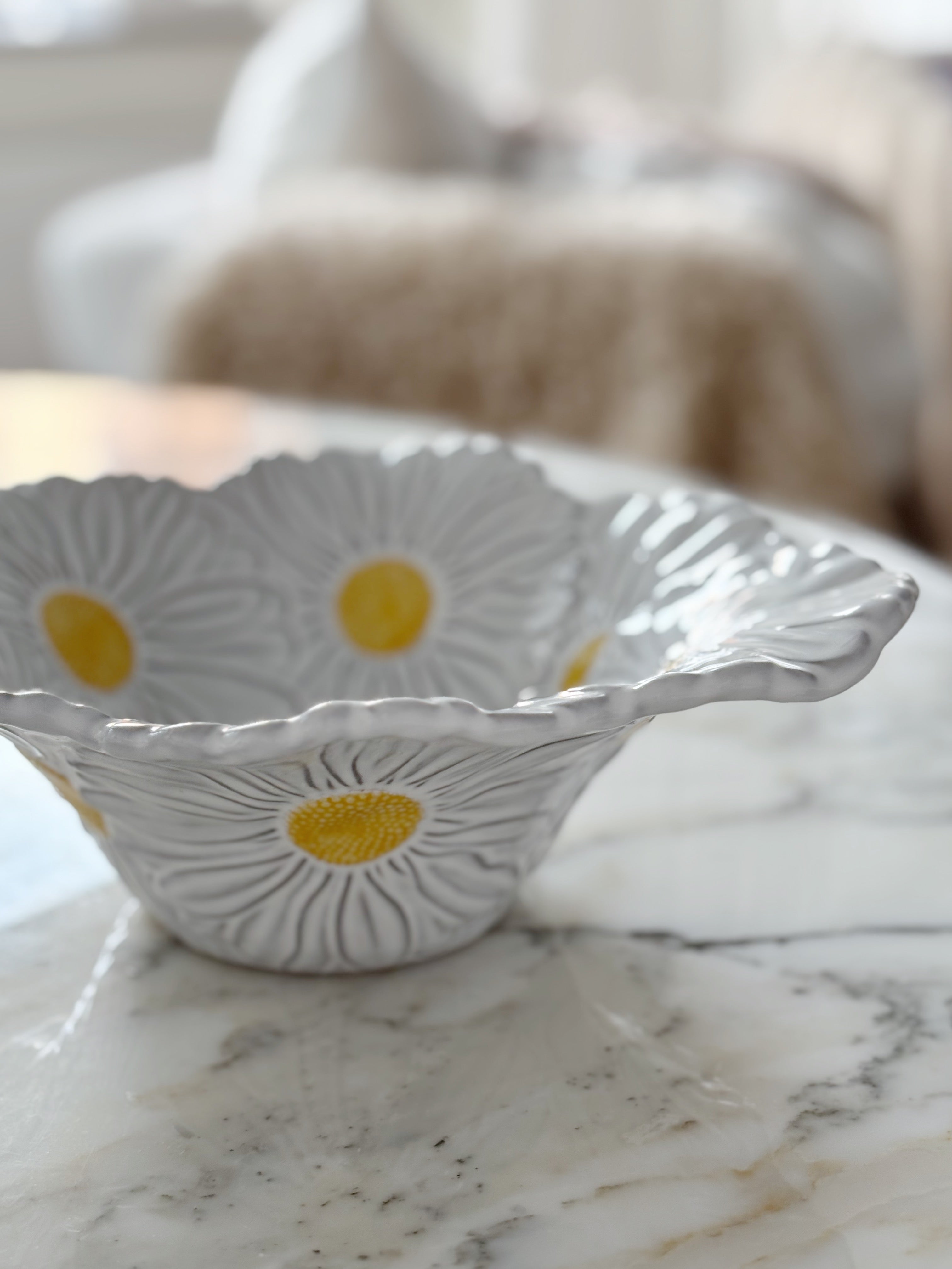 Glaserad, handmålad salladsskål i lergods i form av många tusenskönor. Fantastiskt fin. Från portugisiska Bordallo Pinheiro. Mått: 27 x 24 x9 cm