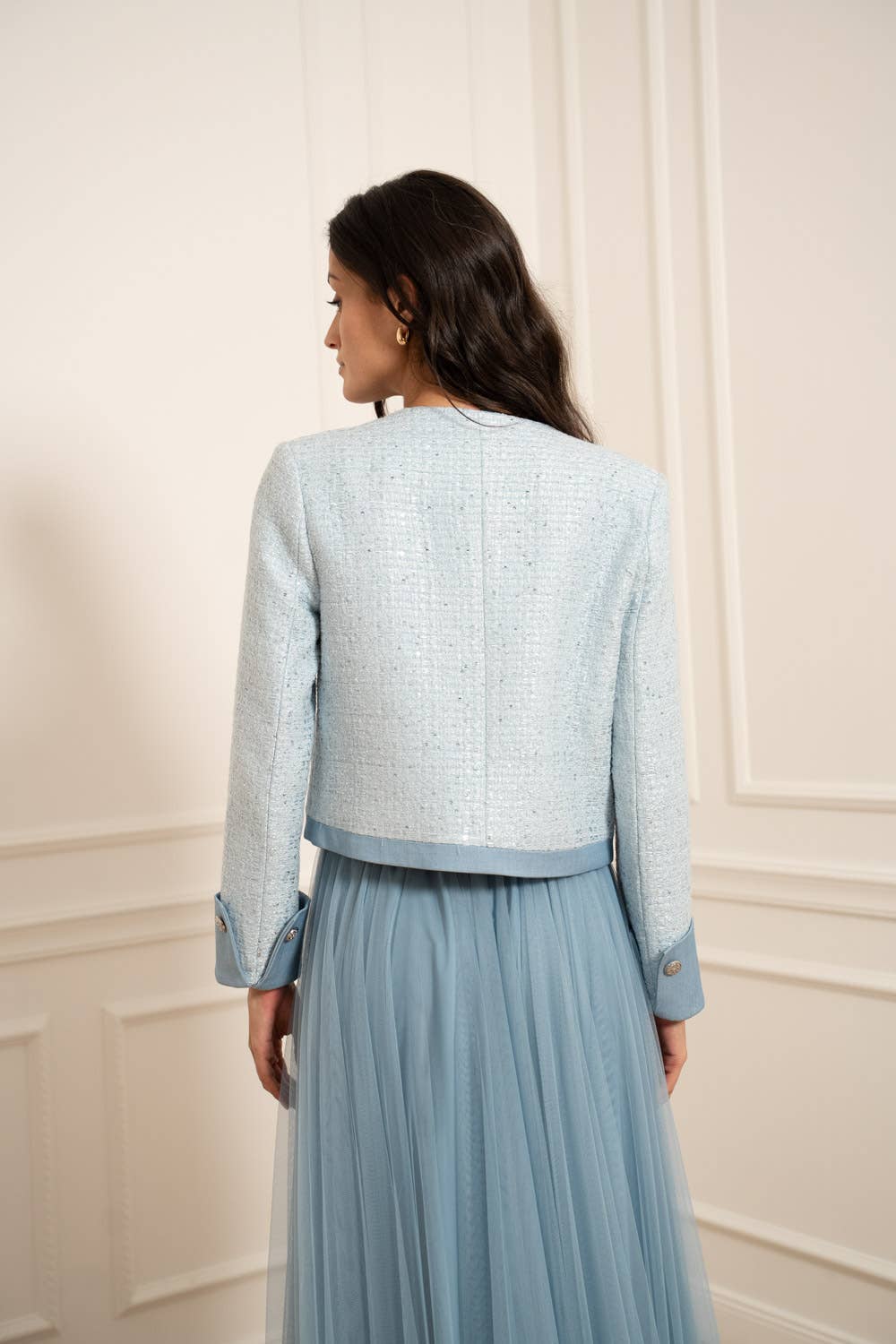 Rundhalsad jacka i tweed och denim: - rund hals - mycket diskret glänsande tweedmaterial - denimdetaljer längs knappslån, fållen och ärmsluten - långa ärmar - smyckesknappar framtill - två påsydda fickor med lock framtill Denna korta tweedjacka förkroppsligar en modern elegans med couture-inspirationer. De kontrasterande denimdetaljerna längs knappslån, fållen och ärmsluten moderniserar plagget och ger det en unik karaktär. Den kan bäras både med jeans för en chic-avslappnad look och med en kjol för en mer sofistikerad look.