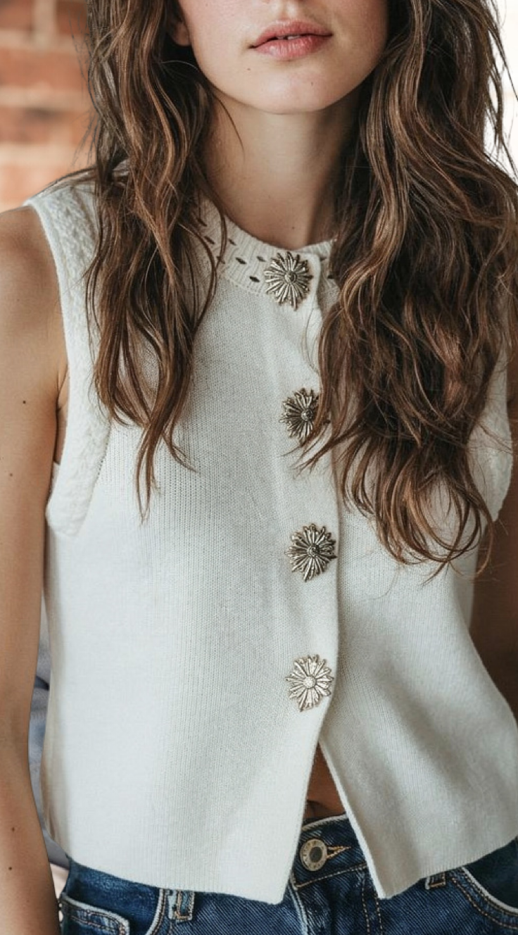Dekorativ stickad väst som bärs fint med en top under eller som den är när vårsolen börjar värma. En väst som kan användas året om. Finstickad med dekorativa knappar i guld.